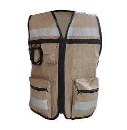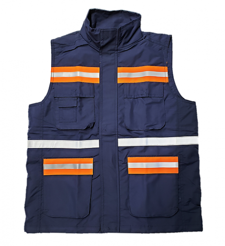 CHALECO 100% ALGODON, CUELLO EN V, CON CINTAS REFLEJANTES ALTA VISIBILIDAD, FORRO DE MALLA, 4 BOLSAS AL FRENTE,, UNA BOLSA TRASERA, CON CIERRE.