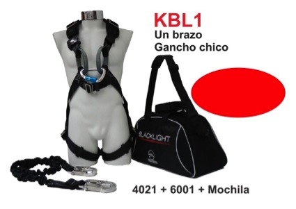 KBL1-1- Kit Blacklight Contra caídas gancho ChicoIncluye: 4021-40 cojín en hombros, anillo espalda, mosquetón frontal 6001-1.80, Amortiguador Interno1 Bzo/ gancho chico, 9001-.90 Punto fijo Anillo en D Aluminio