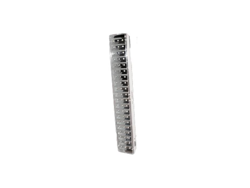 Equipada con 60 leds de alta luminosidad; opera con 4 baterías recargables internas de 4Vcc cada una, como respaldo de energía, las cuales permiten que encienda automáticamente en caso de emergencia por un corte de corriente eléctrica.